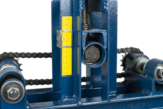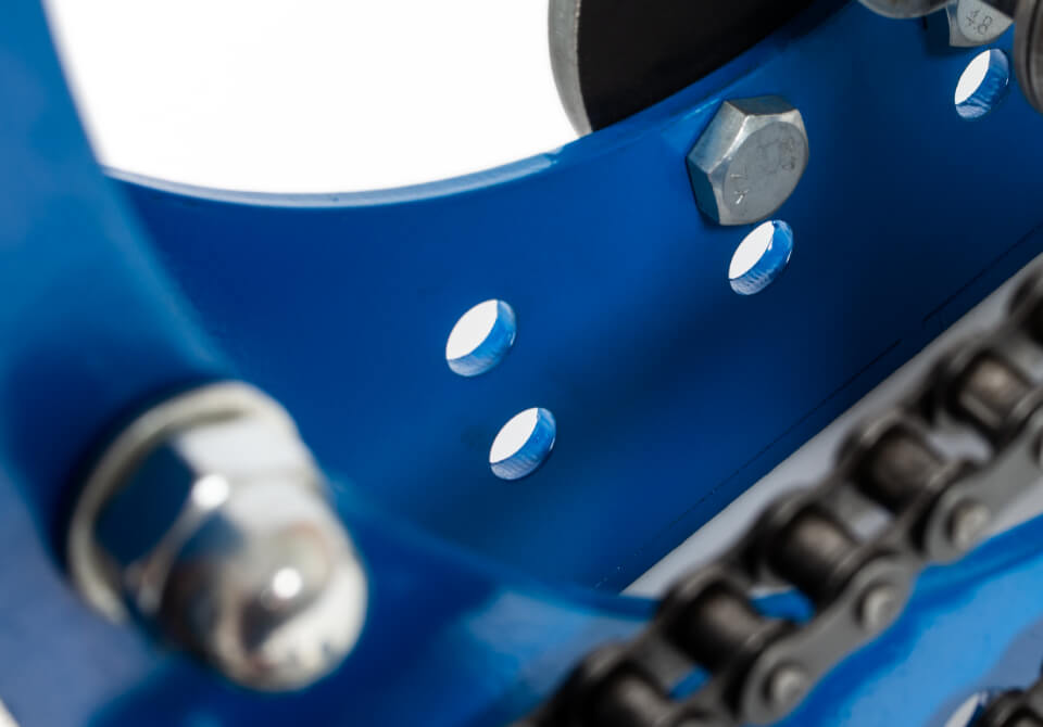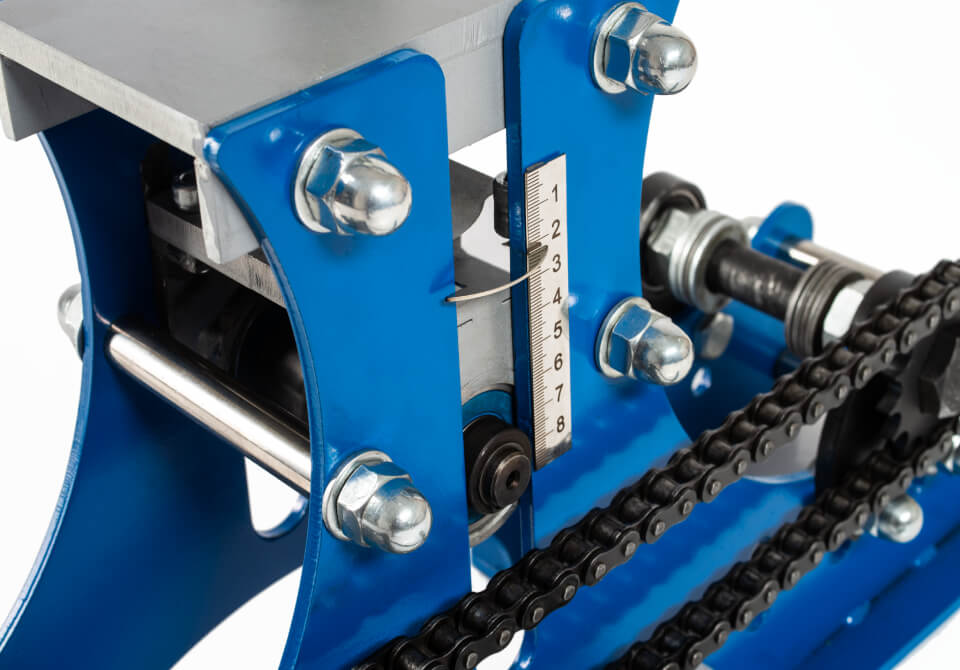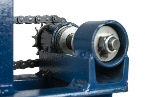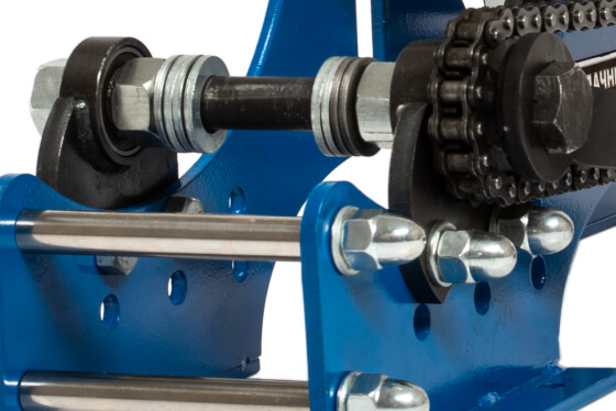 Вороненая рукоятка прижимного винта защищена от ржавчины. Рукоятка привода цепи из твердого каучука. Аккуратные сварные швы и края без задиров. Подшипники закрытого типа, которые не нужно смазывать